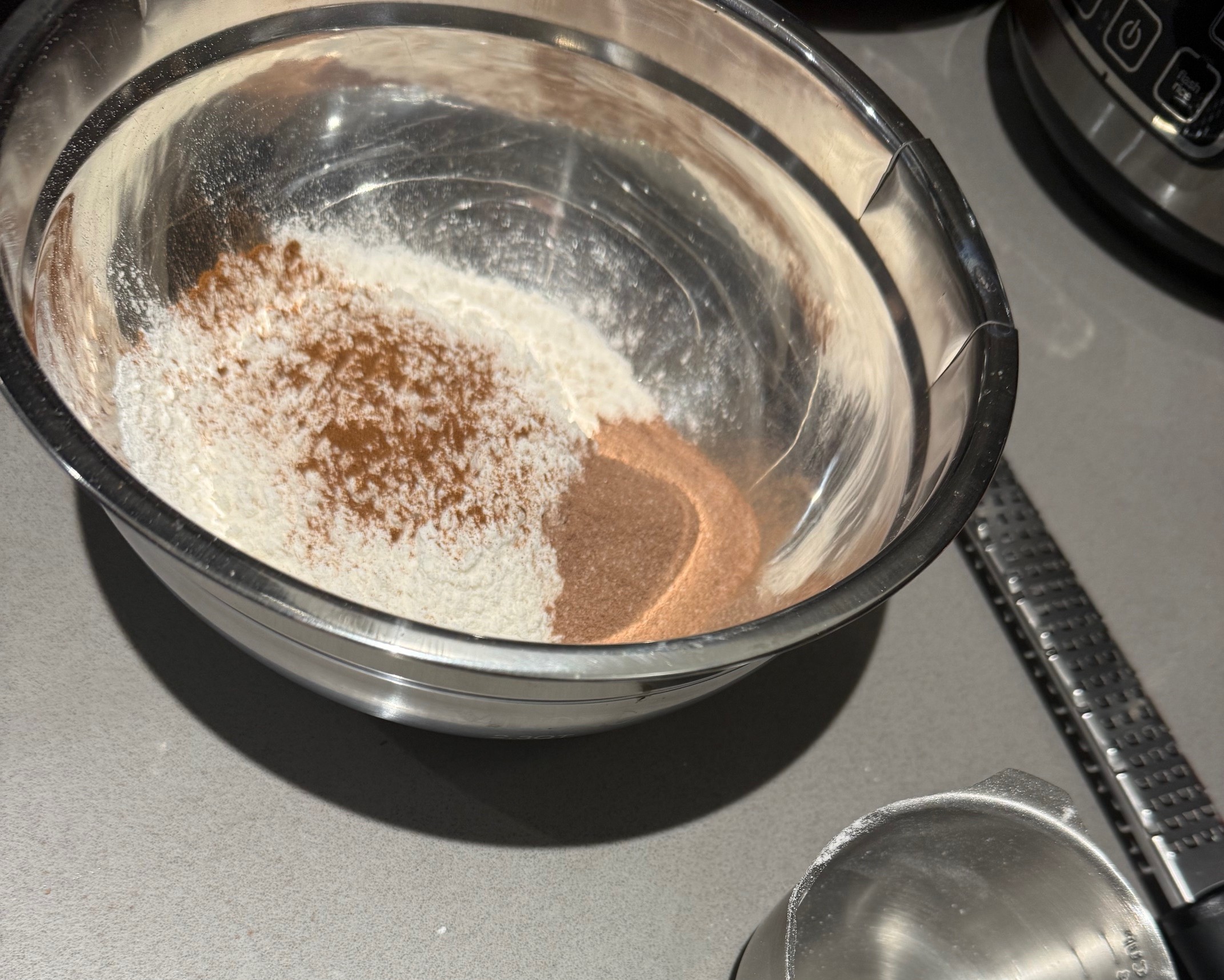 For the dry, it's just going to be flour, baking soda, pinch of cream of tartar, a touch of granulated sugar, a couple scratches of a cinnamon stick for that home-cooked flair and bittersweet cocoa powder for that rich chocolate warmth and the beautiful deep color of our "cup".