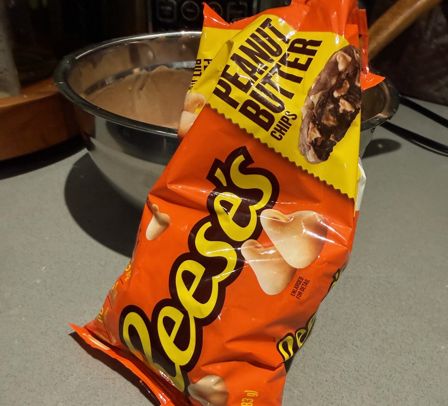 But what's going to do a lot of heavy lifting are the peanut butter chips. The same way people use chocolate chips to get melty chocolate flavor in their pancakes, I use Reece's chips. I'm not ordinarily a brand shill by any stretch of the imagination, but for this, you have got to use the brand name.