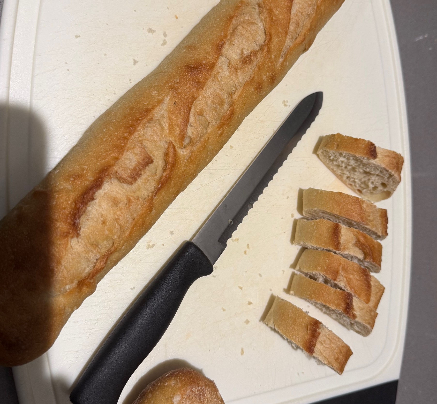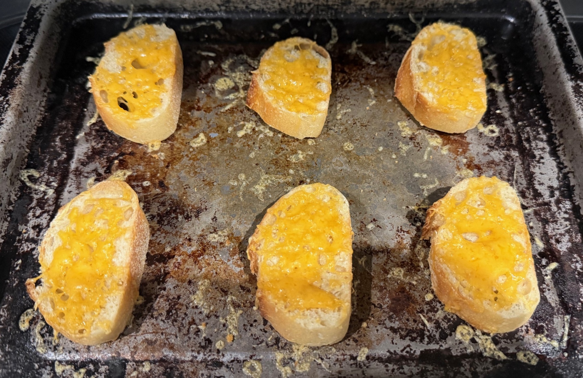 Mise en place here is even simpler. These eggs are extraordinarily simple but elegant. For the crostini themselves, I use a basic French baguette. I take off a few thin slices and bake at a moderate temperature like 350 degrees Fahrenheit (which is about 180 Celsius for the rest of the planet, 453 K for all you physicists). for a couple minutes. Just enough to warm it up and get the middle nice and pliable.