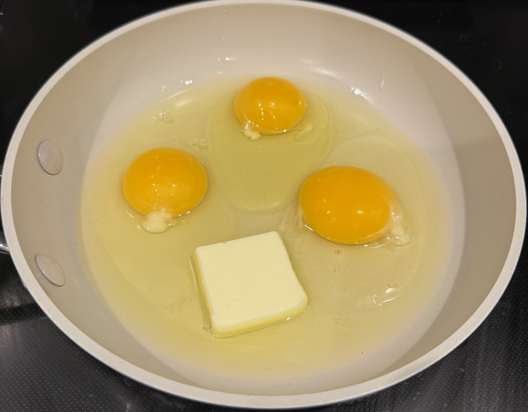 So in the strangest setup you've ever seen an egg cooked in before, you'll take a cold pan and add three eggs and a knob of butter. It is absolutely vital that this is all that has been added.