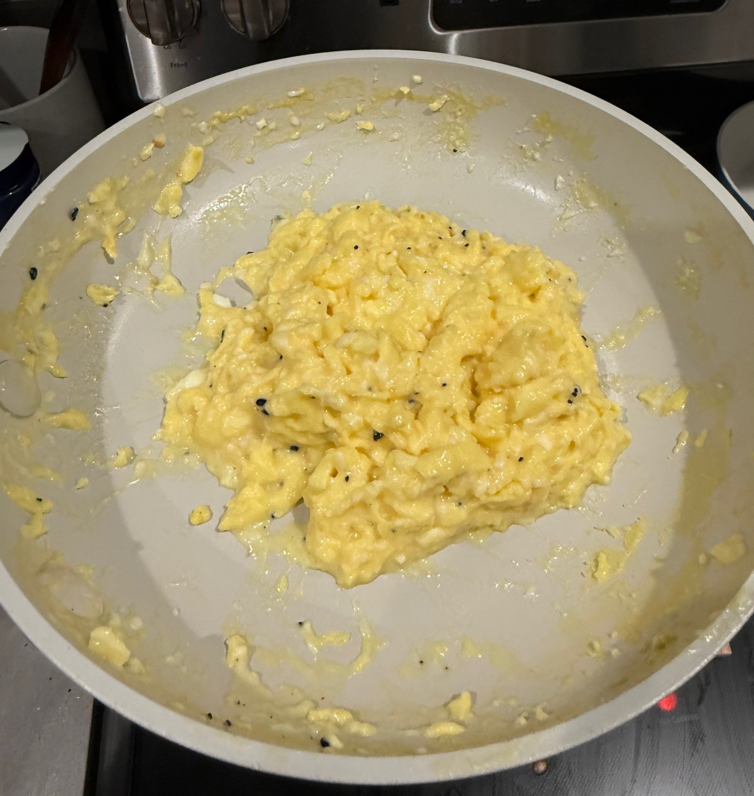 Now you can add the accoutrements. First, a dash of some cool dairy to stop the cooking and make sure the eggs don't dry out. You can use creme anglaise, creme fraise, mascarpone, whipping cream, a sprinkle of melty cheese, or even a dash of milk in a pinch. Finally, salt and a couple cracks of black pepper over the top. It's critical that the eggs are cooked before salt is added, because it can change the osmolality of the white and make the eggs separate and dry really extensively in the pan during cooking. I also sprinkle some homemade everything bagel seasoning (cue Ina Garten voice, "but store bought is fine too") and just a couple final stirs to get everything incorporated.