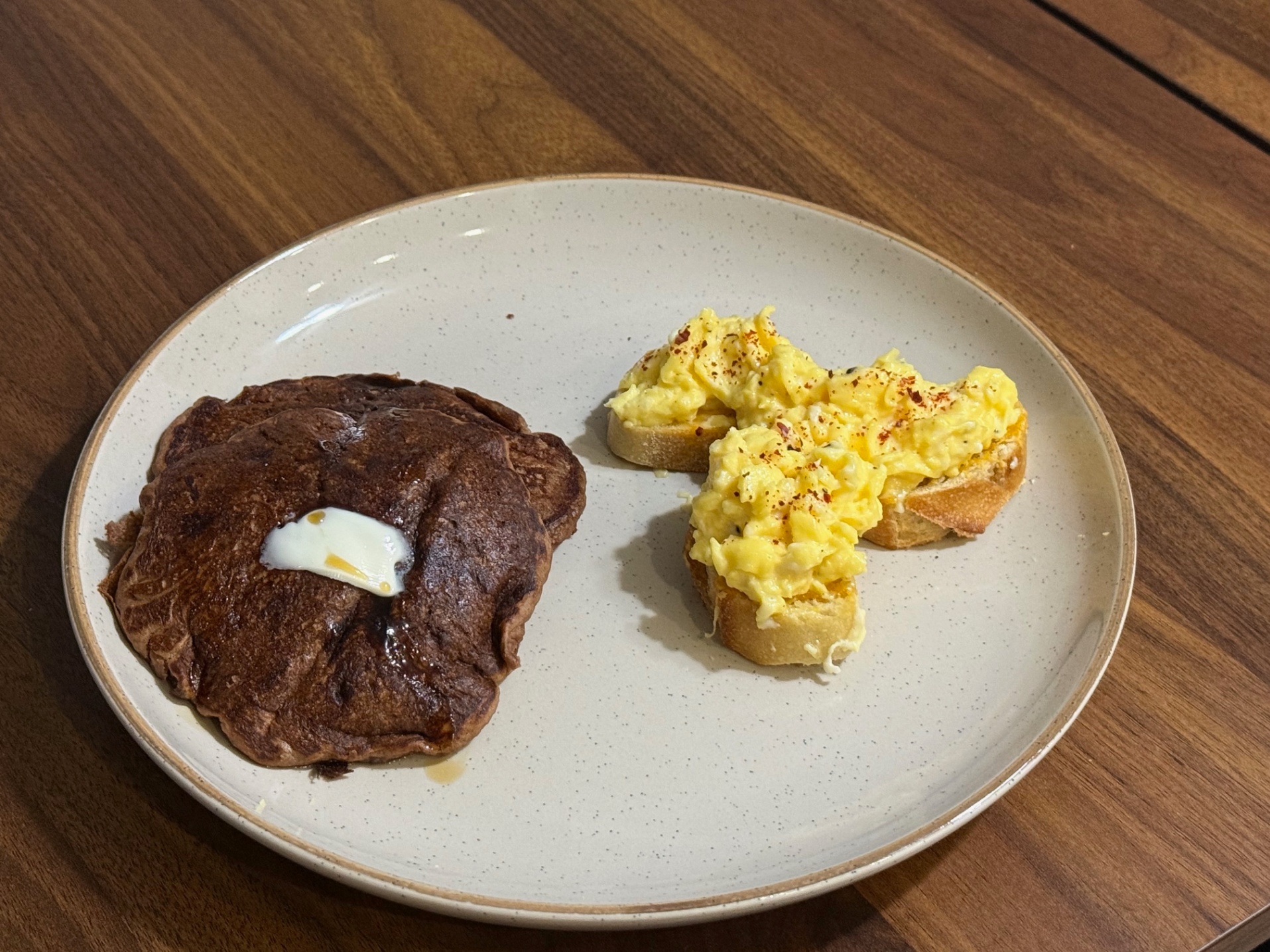 Peanut Butter Cup Pancakes and a Soft-Scrambled Crostini Trio (The Keegan Way)