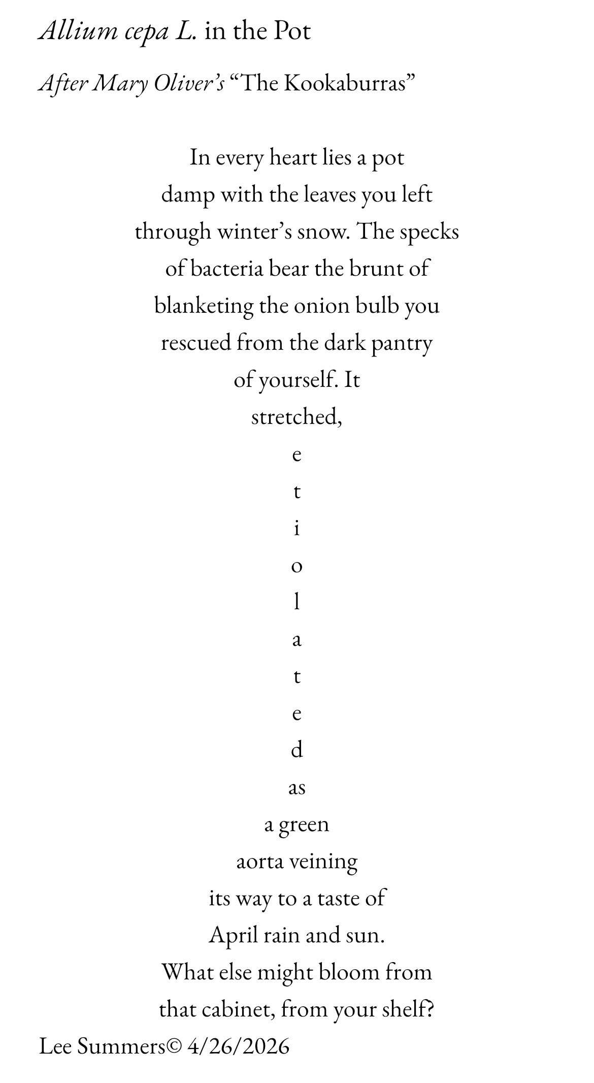 For this poem, I took after Poetry Outdoors’ prompt based on the beginning of the Mary Oliver poem “The Kookaburras.” You can check that post out below, as well as look at what others’ response poems were in the comments: