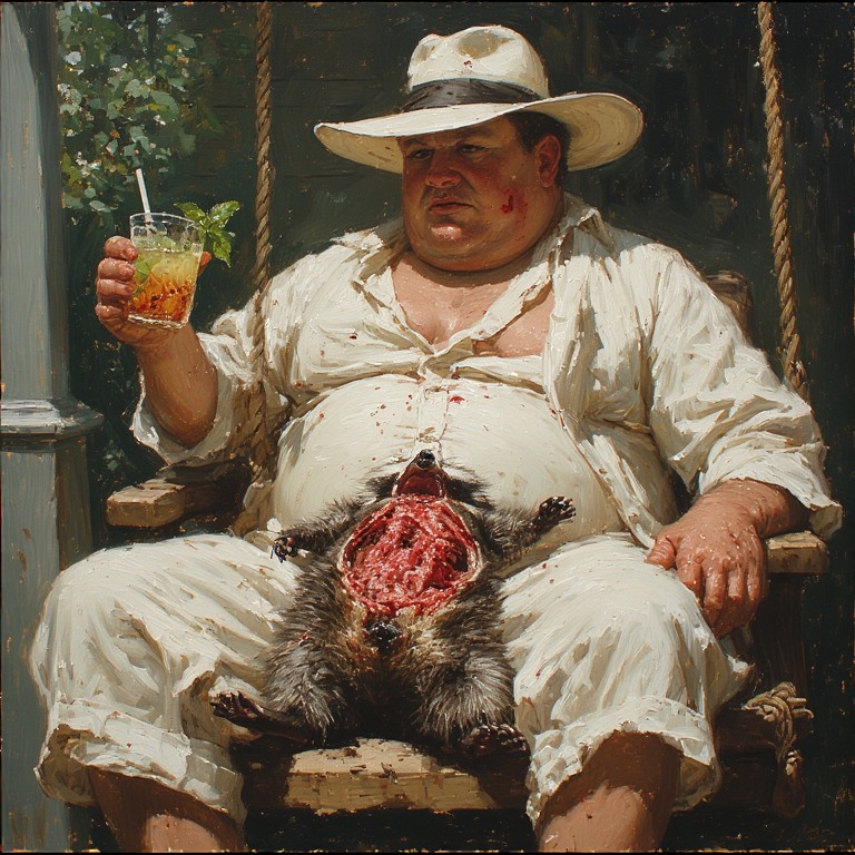Big Daddy shakes with mirth to see a raccoon flayed,