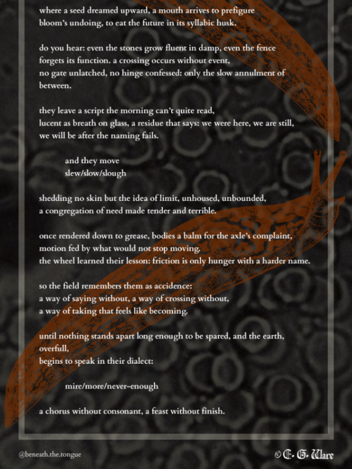 only a wet rudiment, a glossolalia of muscle and sheen,