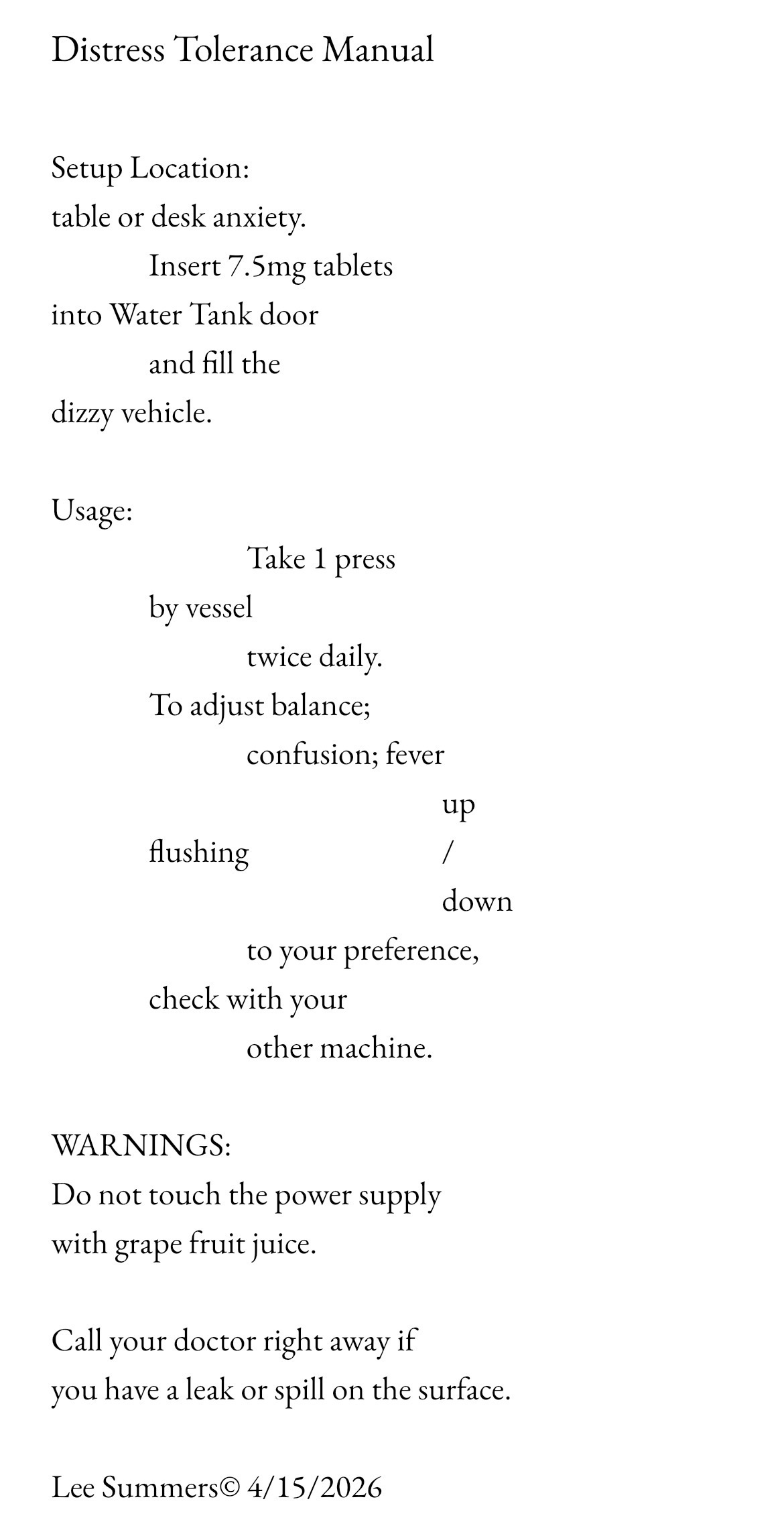 This poem is a found poem I made using a manual for an evaporative cooler and my prescription. Here's to being halfway through NaPoWriMo, and hopefully to finally getting my dang AC fixed tomorrow.