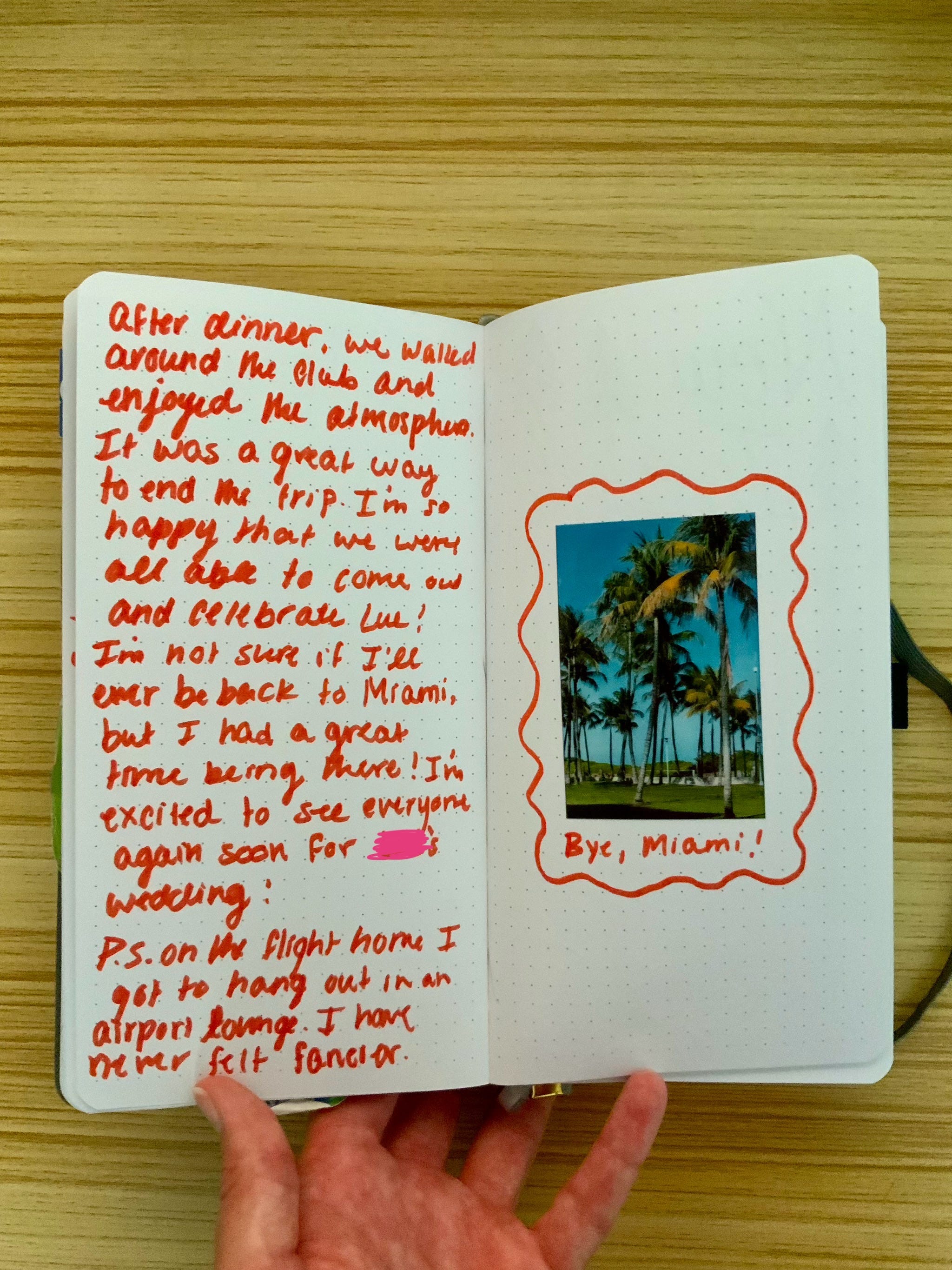 For my Miami/New Hampshire spreads: the writing is uneven (I wrote it in marker because I was too lazy to get off the couch and get a pen) and the drawings are wiggly. There is no washi tape or extra fluff. When I started this book, I bought typewriter letter stamps to add to the “aesthetic”. Do you know how fucking long it takes to stamp out a full word in letter stamps?? I’m trying to actually enjoy my trip, not live in letter-stamp purgatory.