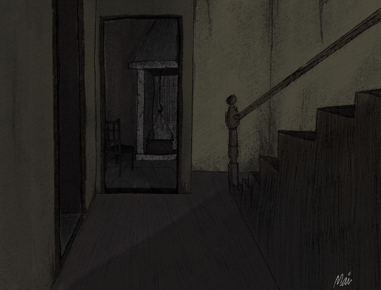 Now lit, the house that was once big and elegant was now a narrow old thing with an unavoidable claustrophobic feeling. Before me there was a small corridor with very dirty and rough ground. At its end was a kitchen with a stony hearth and a wooden chair. I had an uncanny feeling creeping up the back of my neck. The house was clearly old and used but somehow felt like it was an exhibition with the objects meticulously thought about in order to appear as believable as possible. All the other rooms were dark and the staircase on my right side that led to the upstairs floor was the only path that didn’t seem like a dead end.