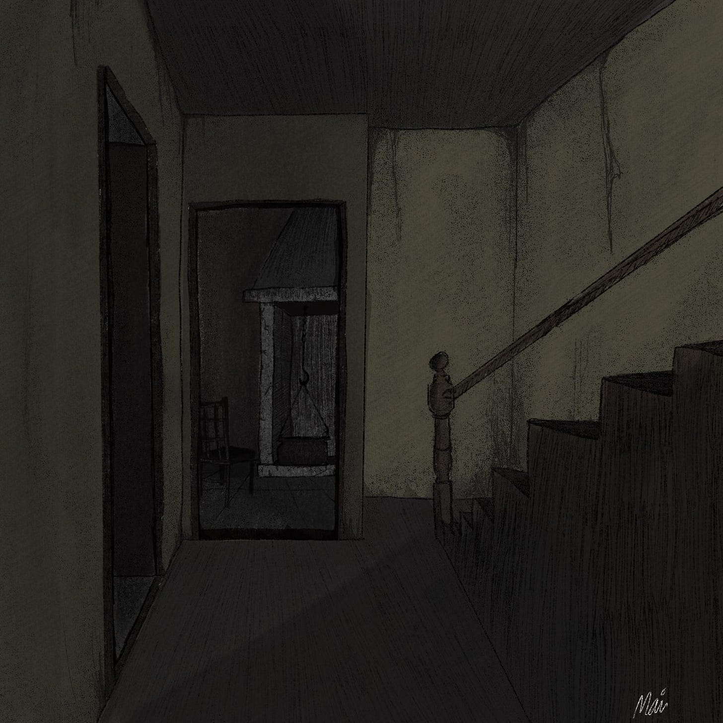 Just as I opened the door, I took a step back. The girl now had very long hair that was supporting her whole floating body. Her face was pale and her mouth and eyes were pitch black holes. I quickly turned around and started running, without even closing the door. Now that I was trying to escape, the house seemed to stretch in front of my feet, with never ending corridors and stairs. After what felt like an eternity filled with chaos, I finally reached the entrance and ran outside.