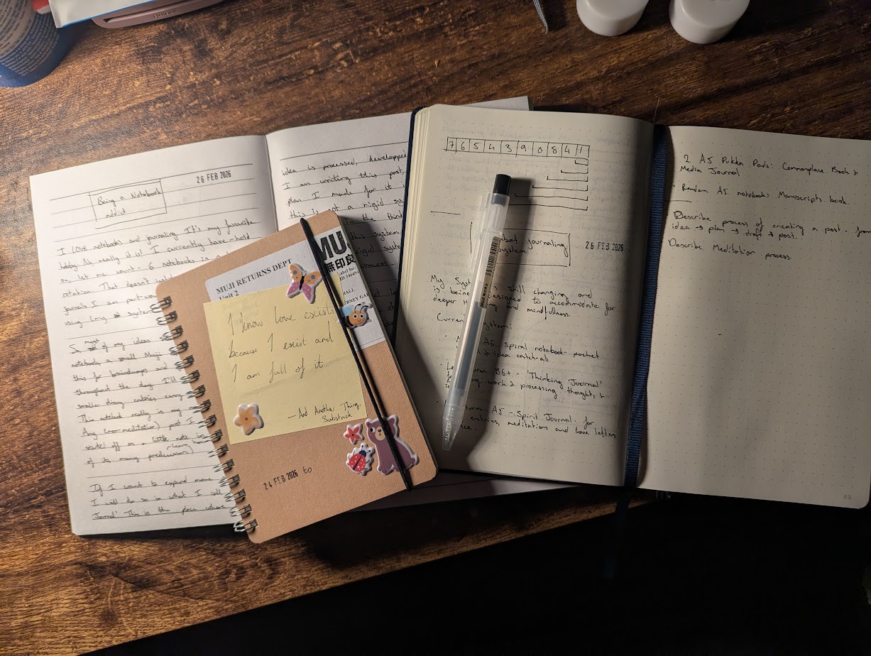 Most of my ideas start off in my newest notebook, a small spiral-bound notebook from Muji. I use this for brain-dumps and general idea capture throughout the day. I'll also use this every now and then for smaller diary entries! This notebook really is my raw, unfiltered thoughts. Any (non-meditation) post I have made has started off as a little note in this book (or one of its many predecessors).