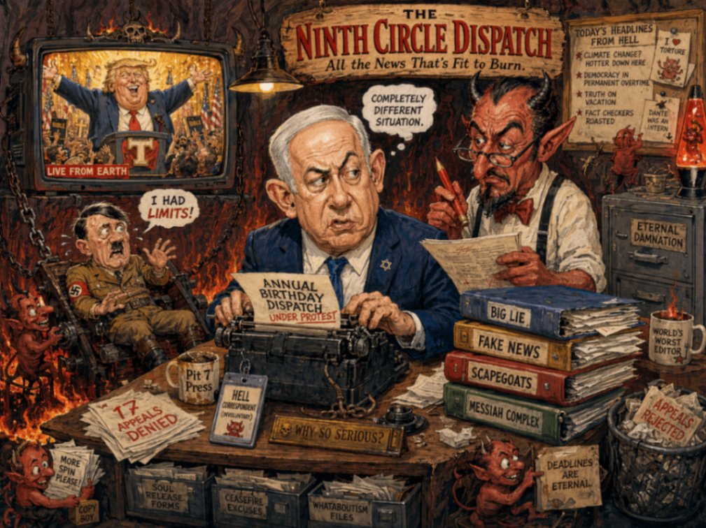 By Benjamin Netanyahu, Hell Correspondent (Involuntary) — Filed from the Seventh Pit, Ninth Circle, Hell — Edited, barely, by Senior Infernal Editor Graft Perdition, Demon Second Class