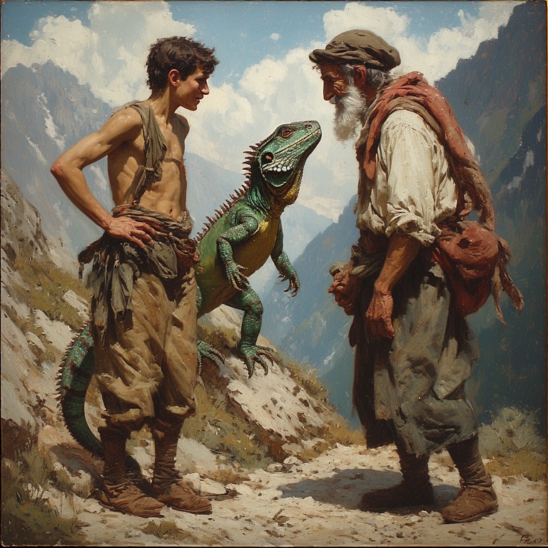 "I hear your dispute," said the lizard. "From both I hear wise words spoken, yet there is no easy reckoning to reconcile them. I propose a way."