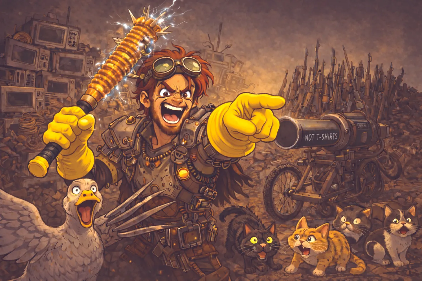 You think I’ve been collecting old washing machines and busted microwaves for FUN? Every magnetron is a component. Every car battery is stored power. Every length of copper wire is INFRASTRUCTURE.