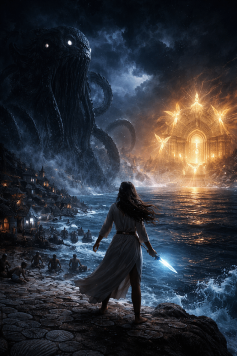 Mara looked down at the kneeling village, at the homes grown from salt and bone, at the children with their foreheads pressed to shell. Then out toward the light beneath the sea. Toward the sanctuary she had loved all her life, now risen in monstrous beauty, capable of burning an entire people because she had loved it too completely.