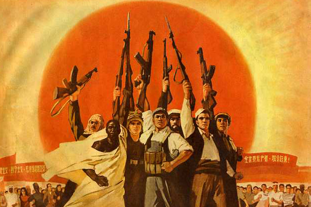 The assembled people in the cavern raise their fists and listen.
