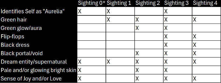 NOTE: Nothing from Sightings 1-4 contradicts any of the others: it’s just as likely a detail missing was forgotten or simply neglected to be documented as opposed to clashing with the rest. (i.e. nobody remembered a name from sightings 2 and 4, but the only times she’s provided a name, it’s been provided as “Aurelia.”)