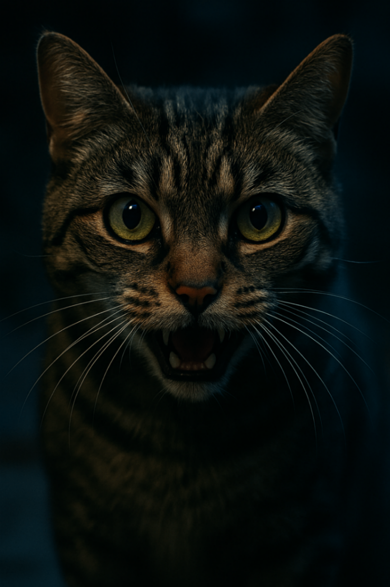 A raccoon, fat and arrogant, ransacks a trash bin. I watch from the fence, tail lashing. Timing is everything. I drop like a guillotine blade. Claws hook into its flank, teeth punch through the soft underbelly. It shrieks, a sound like tearing fabric, and thrashes—knocks over a barbecue. The lid slams shut on its paw. Bones snap. It flails, a broken marionette, tumbling into the rose bushes, thorns hooking into its matted fur. I lick my chops. The copper tang of its blood lingers. I purr, a sound like a file on bone.