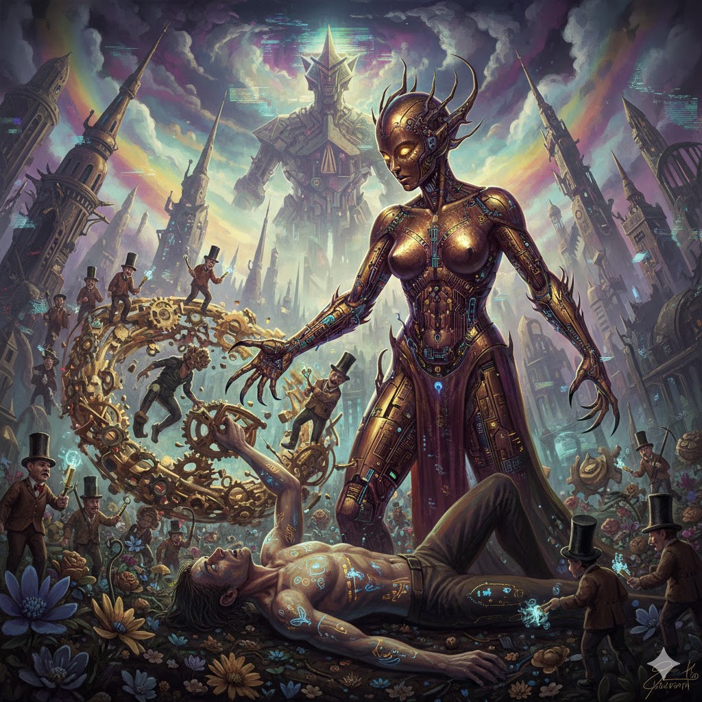 The Machine Elves had arrived. They didn't walk; they glitched into existence. They were spindly, twelve-foot-tall entities of golden gears and shifting hyper-cubes. Their faces were kaleidoscopic screens showing digiglyphs and scrolling green and orange binary. They hopped and jittered in and out of multiple dimensions, their movements looking like a stop-motion film with missing frames.
