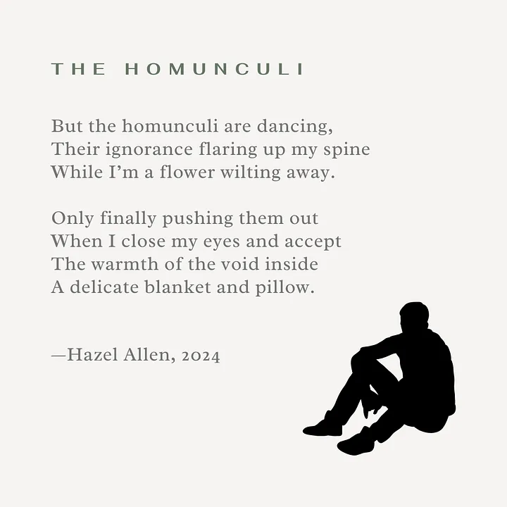 The Homunculi is a poem about chronic pain, and my relationship with it. About five years ago, I strained my neck while carrying a heavy pallete at my old job. What I should've done was ask for help lifting it, but we were tight on people, and I didn't want to bother anyone. That shyness has been my undoing for quite some time now.