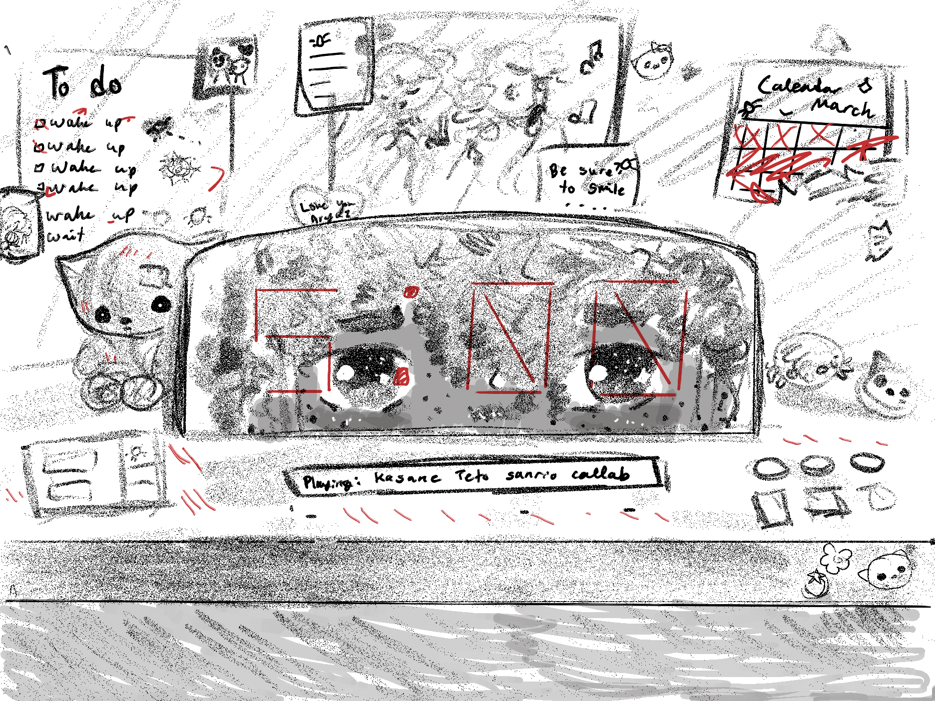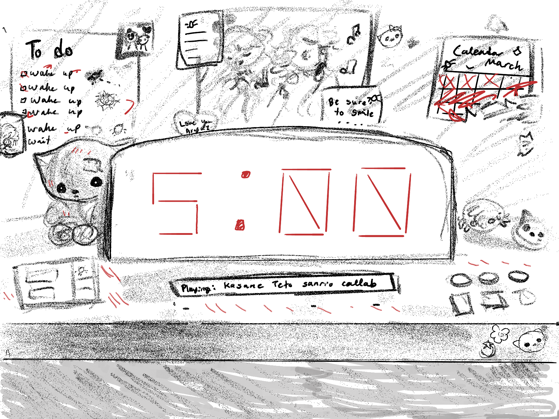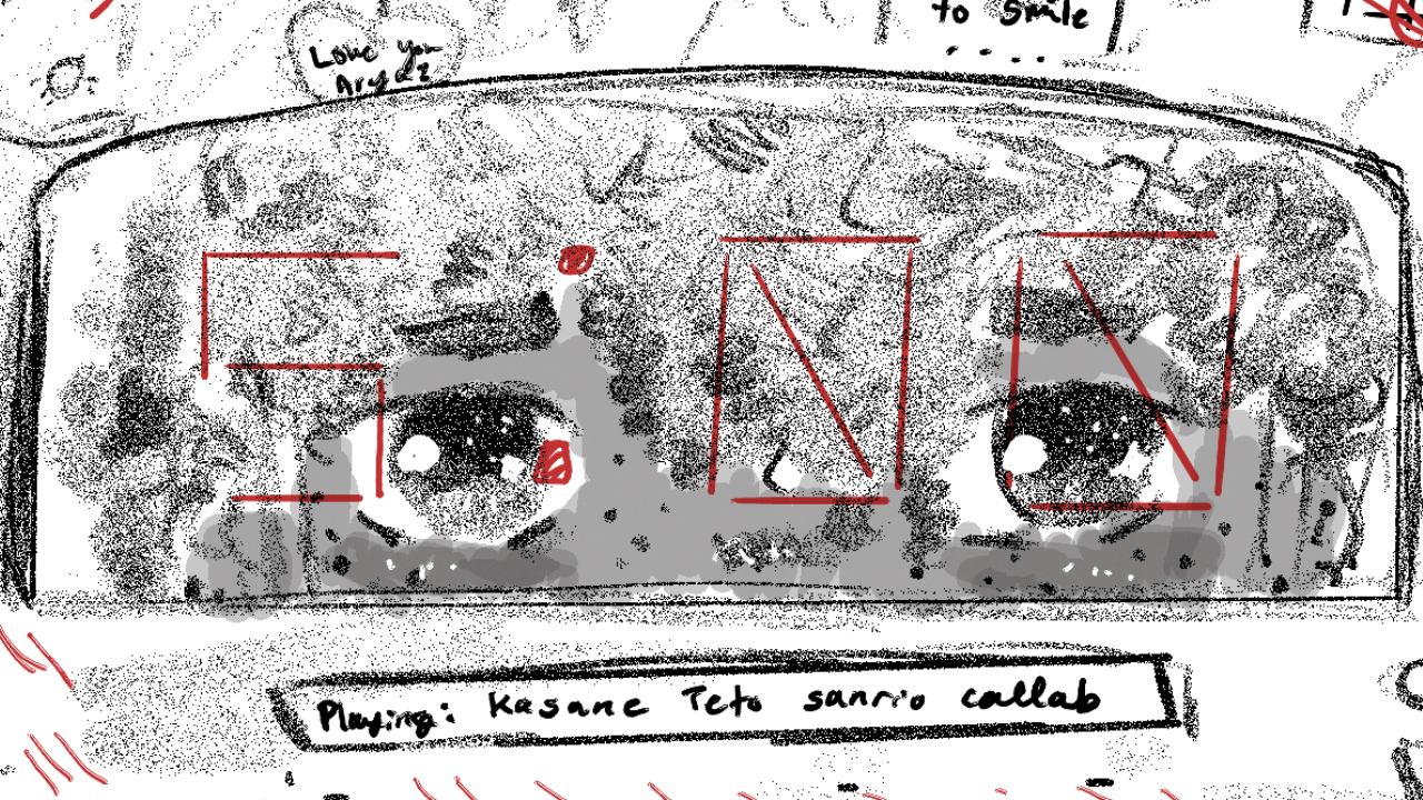 Five minutes. I fish the coin from my old sweater. Hello Kitty smiles with worn, dead eyes as I steal my treasure from her. A lollipop and a small photo album–I kept losing my phone–tumble out afterwards. They join the coin at the windowsill–celestial objects dotted among the darkness so I can enjoy myself. The clock ticks. The projection repeats itself, now stuck on one word as it buffers and loads.