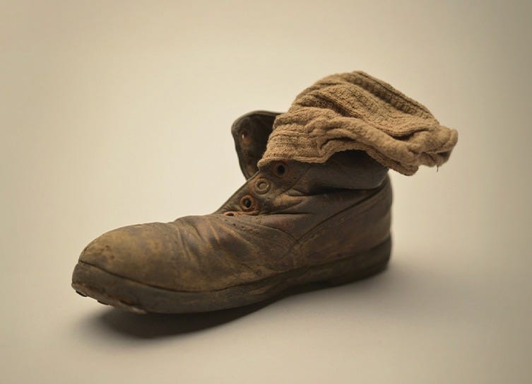 The shoes are floor to ceiling behind a long window. Thousands pressed together, a landscape of them, every size and shape and degree of wear. His eye moves across them the way it moves across any overwhelming thing, looking for somewhere to rest. It finds a child's shoe near the middle of the pile. Brown leather. Small. The toe worn pale where it met the ground with every step, the leather creased and shaped by a foot that is not here.