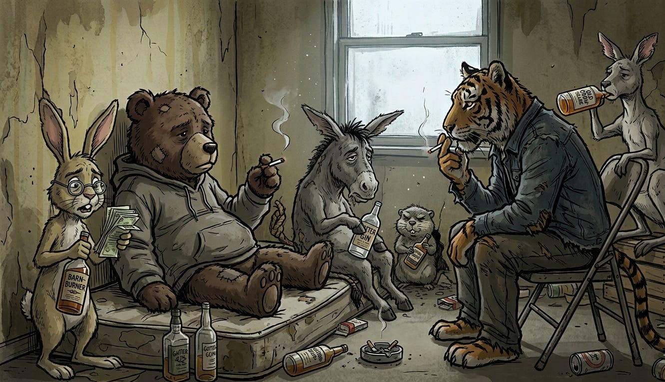 “Channels? Appeals? The LAW?” Tigger snarled, his face inches from Rabbit’s. “You useless f’n bureaucrat! Your channeled-brown-soaked-whiskers just got us flushed! G-AhW-n. You spent your life sucking their collective fcknnn-at this point he couldn’t stop himself-teats for a seat at THE table, and look—the table just got sold out under all our ass. Bunny-Boy.” His claw poking millimeters from Rabbit’s heart, but no less felt.