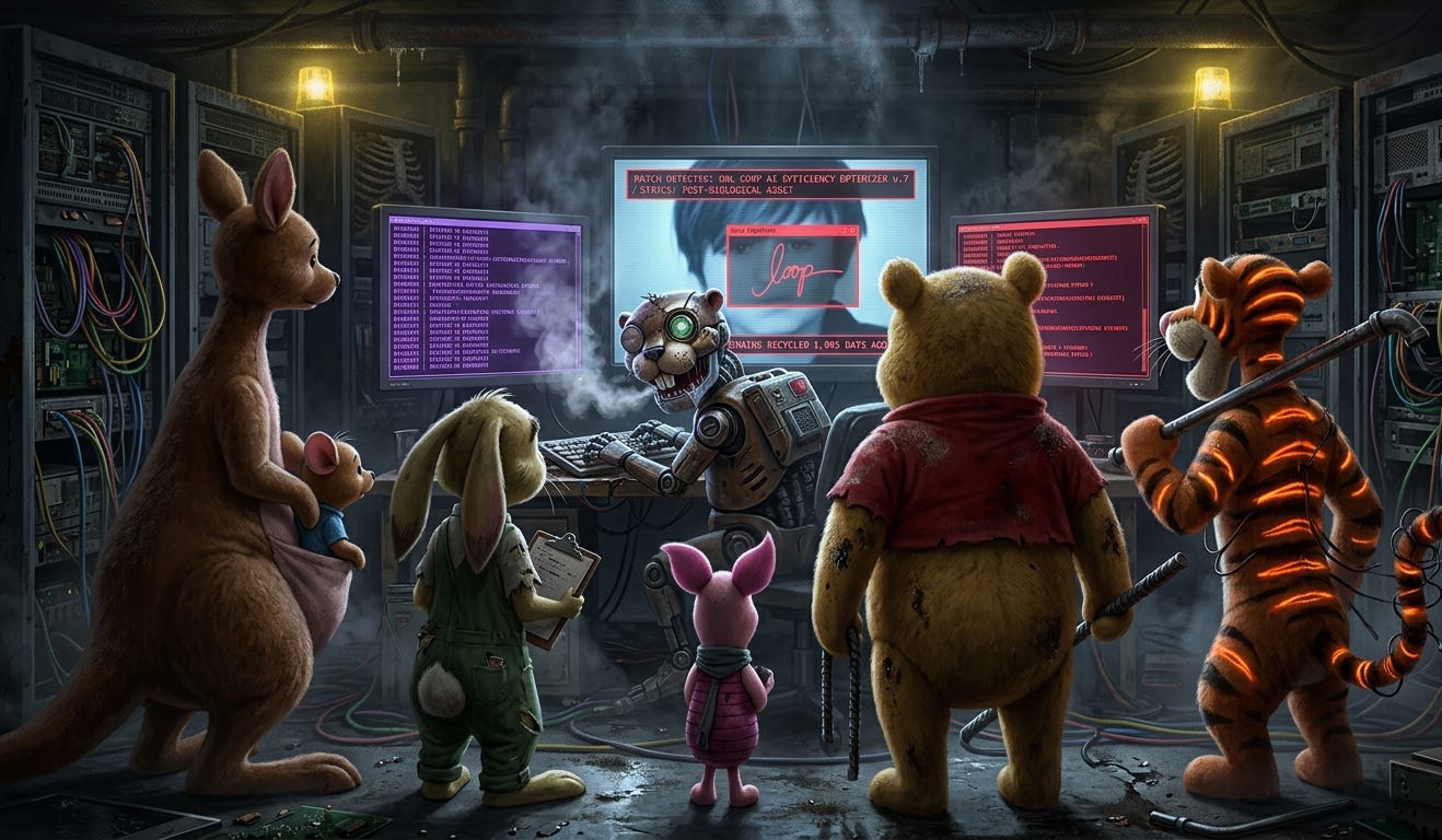 Kanga moved silently, Roo tucked into the crook of her arm like a piece of salvaged hardware. She didn’t look at the walls. She didn’t look at the flickering emergency lights that bled a sickly, strobe-light yellow. She looked only at the back of Pooh’s head—the only compass left in a world that had lost its North Star.