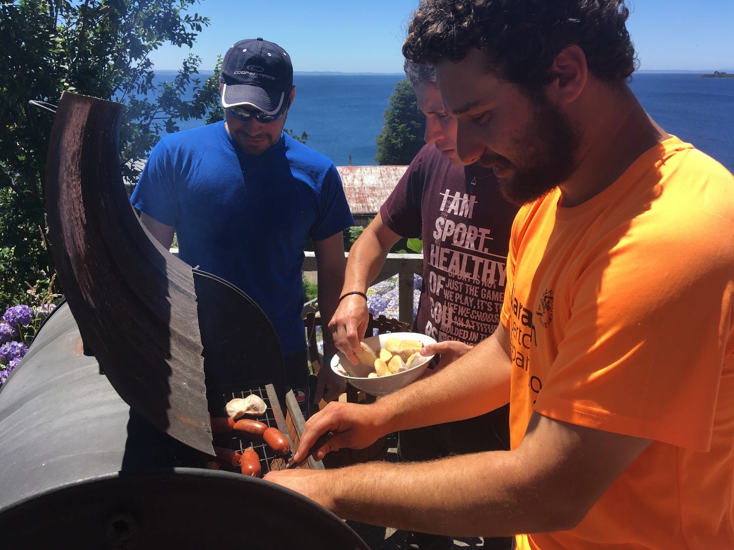 This was the asado we hosted in Puerto Varas for Max’s friends and families. That’s Max grilling chorizo for choripan, a traditional Chilean dish where you pull the innards out of a roll and stuff a link of chorizo in it and then put pebre—a kind of Chilean salsa—on top. Deee-licious. Some Chileans also put mayonnaise on it, but then some Chileans put mayonnaise on everything. Next to Max is his friend Lucho, a chef who is, and there’s no other way to say this, grilling bull testicles. I think I can safely say that the only item that would rank higher on my wife’s list of “Things I Really A Lot Don’t Want To Eat” than grilled bull testicles would be bull testicles prepared any other way.