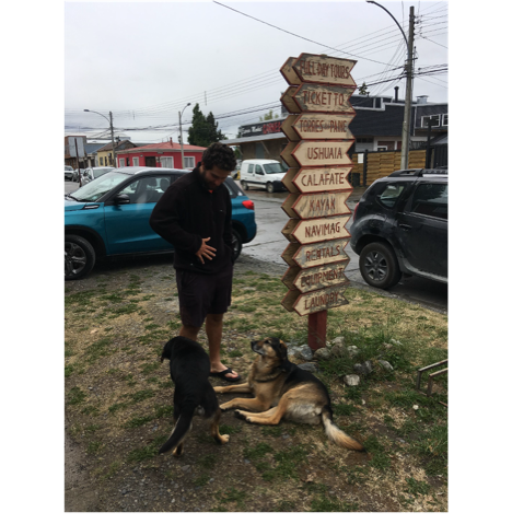 There are stray dogs everywhere. Now, even though I know you probably love dogs, you might think that this would be more accurately placed in the What’s wrong with Chile category, but the fact is they are almost uniformly pleasant, seemingly happy and well-fed, and not at all aggressive. There’s apparently nationwide agreement that they should be fed and petted regularly. In Puerto Natales, Max’s friend who ran the hostel had a small, fluffy, white inside dog named Mimi, but just outside the front door on the grass lived two delightful hounds named Amor (Love) and Oejita (Ears), and sometimes they came inside when the door was opened, and nobody had a problem with that. Here’s a picture of them with another hound-like creature.