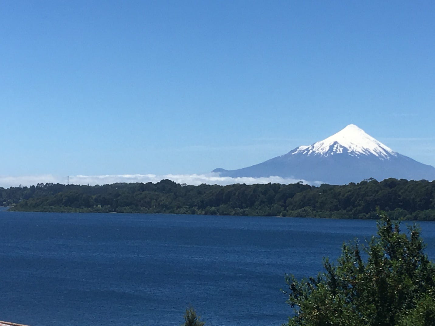 That’s the view of the volcano Osorno from our Airbnb in Puerto Varas in Chile’s Lake District. It’s kind of also its Volcano District, as if you drive on one nearby road there’s a clearing where you can see three volcanoes simultaneously: Osorno, Calbuco, and another one—they’re like The Three Tenors that way. That’s Lago Llanquihue in the foreground, which is Chile’s second largest lake, about 25 miles across, dotted with lovely beaches and filled with very chilly water.