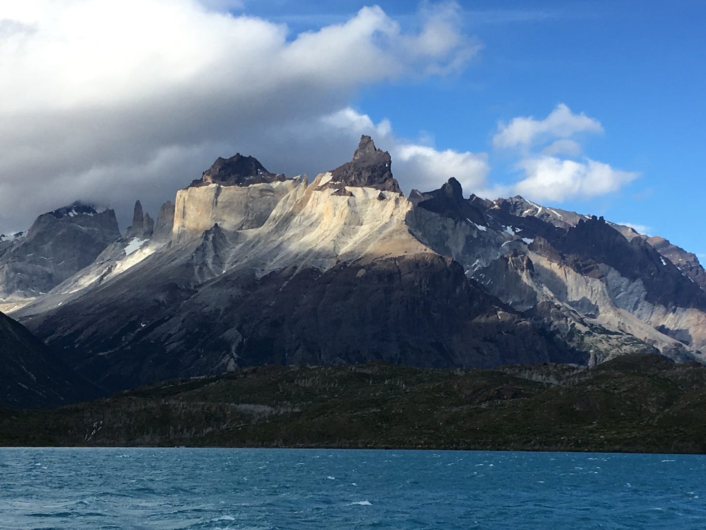 The people. The Chileans we met were incredibly kind and hospitable, and they also seem to be very funny, though frankly since I speak almost no Spanish I might have missed a punch line or two. We stayed three places: Puerto Natales (because it’s close to Torres del Paine, a national park with gorgeous hiking—here’s a picture of one of the cuernos, or horns, in the park)