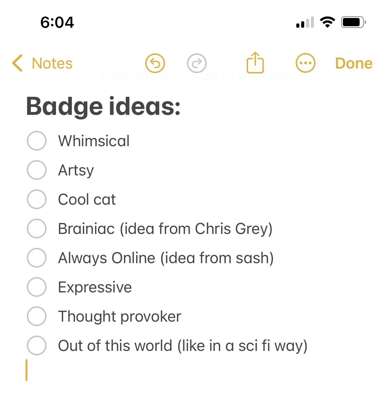 Some ideas for new badges 👀 I’m making a list to send to @noh so add yours!! Also I would personally die for “cool cat” please please please