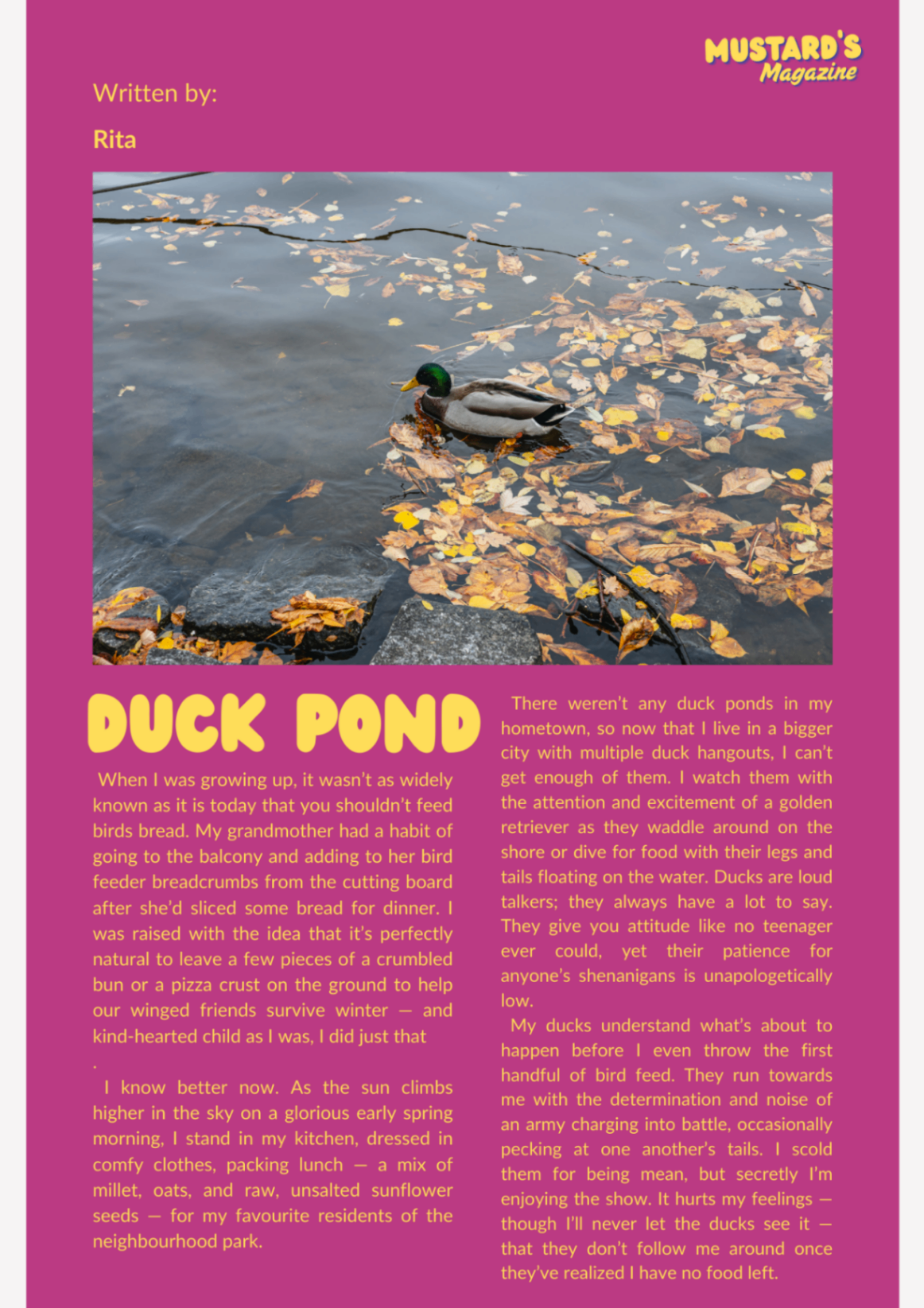 Mustard is excited to share with you a preview of what Mustard's Magazine will probably look like. Will mess around with it some more but they really like this format. Going to find a font for the main body that better fits the vibe. They would like to thank @nowrongwords for their column! :)