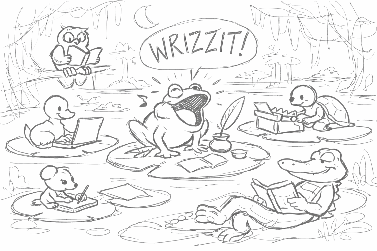 I did illustration work for decades until arthritis hit hard and 2 carpel tunnel surgeries didn't help. Inspiration and Calipeg can do wonders. If anybody digs it I could get my grand daughters to ink and color. Might take a week as they are busy girls. If anybody else wants to go ahead, I don't copyright swamp critterz.