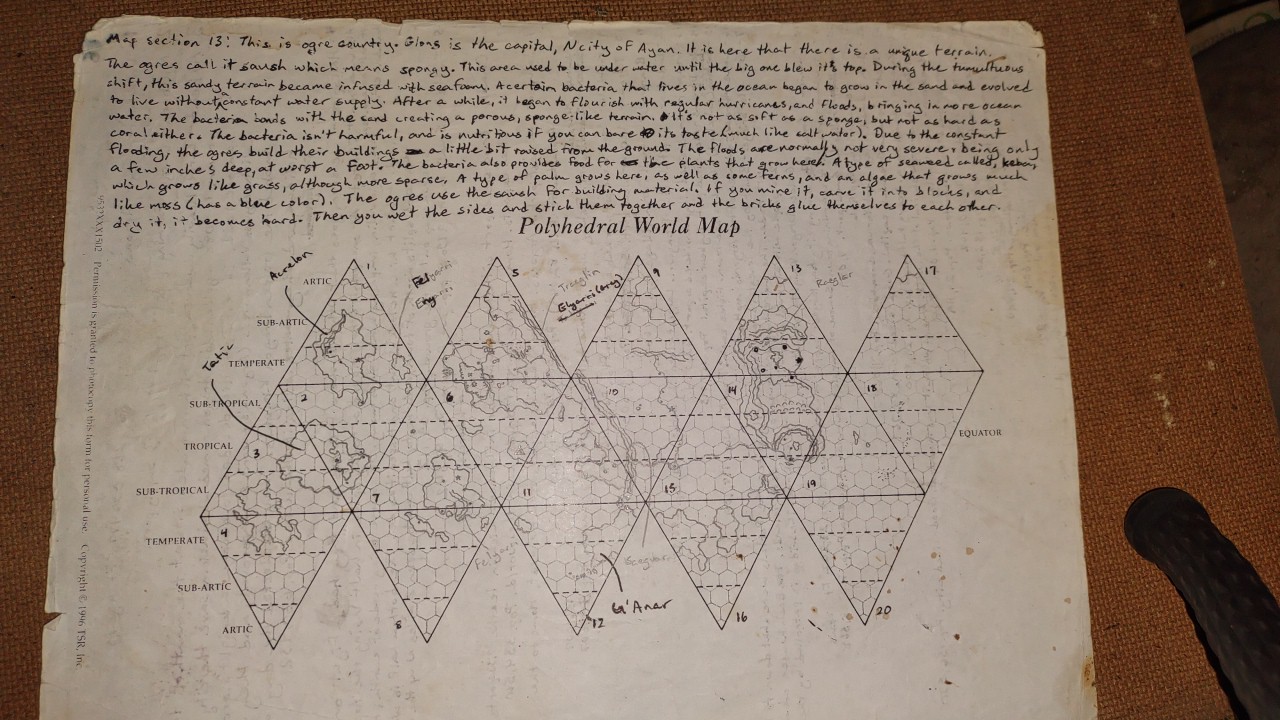 Good night, Wrizzlers. I leave you with something very dear to me. This is the map of Argonis, the classic fantasy setting in my WIP TTRPG, that I drew when I was 18. The template is from my favorite book: The Worldbuilder's Guidebook from Advanced Dungeons & Dragons. For reference, the triple lines in the middle is a long mountain range....[[|:-)