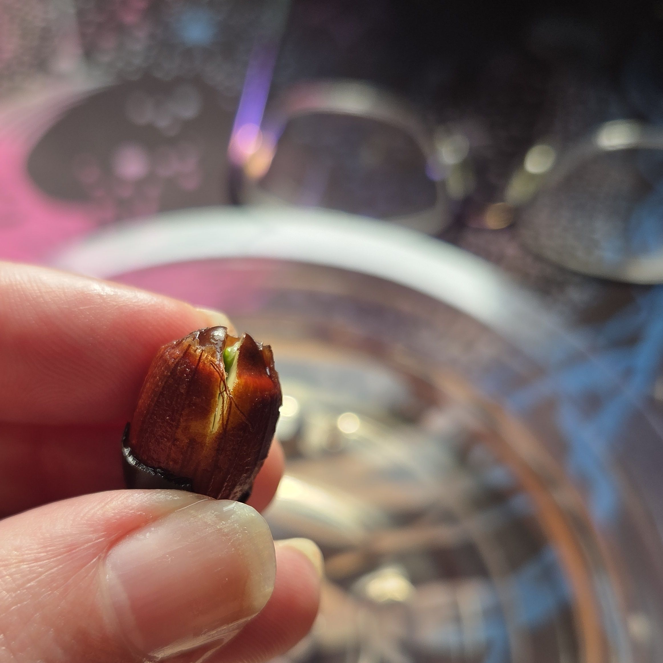 My lotus seed is opening! That hint of green inside will, hopefully, become a sprout in a few more days.