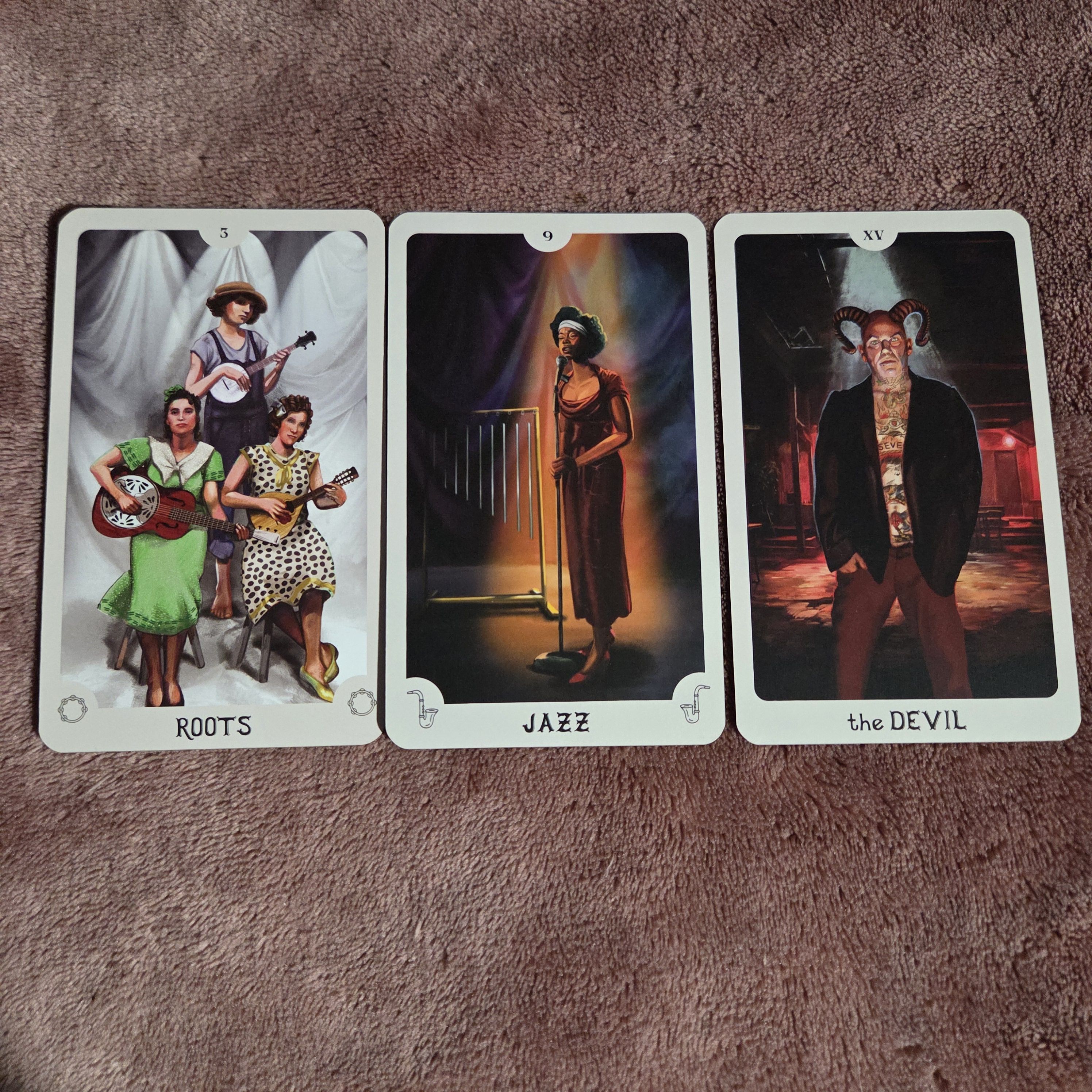 For those interested in a quick look at a tarot reading for this week... These cards are from the Rhythm & Soul Tarot. Roots = Pentacles, Jazz = Wands. We start with there being something that needs to be group work, but then it feels like a lot of work is being done alone. That doesn't stop it from happening, but it does make the work seem harder. Maybe also slower. Then we look at what The Devil has to say about this. Maybe you are working alone, but it would be because you've somehow put yourself in that position. Or maybe you feel like you're alone because you're not paying attention and giving credit to others. The Devil warns us that we are creating our own obstacles. Think of him as a liberator in that way! If you get that warning and take a serious look at how you may be sabotaging yourself, then you know where you need to make changes. You aren't as alone as you think you are.