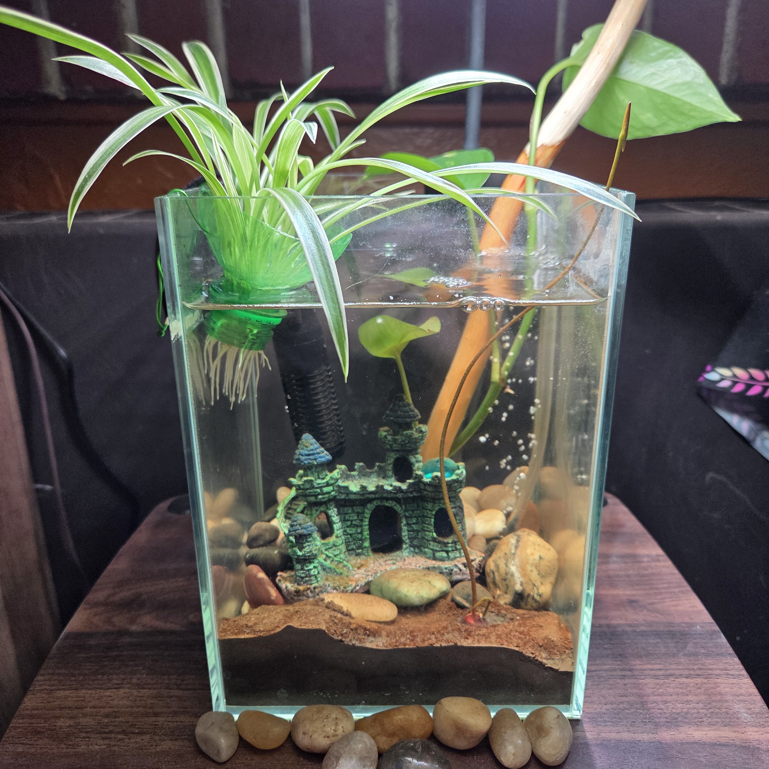 My tiny 2 gallon lake today. Growth has sped up for Rufus, so that's him poking up out of the water on the right side. There's also a second shoot starting to come out of the seed. My stress seizures prevent me from being able to make trips to a nearby lake without a companion in case a seizure happens, and I'm very far away from the waters of my home. This little aquatic garden has quickly become very special for me.