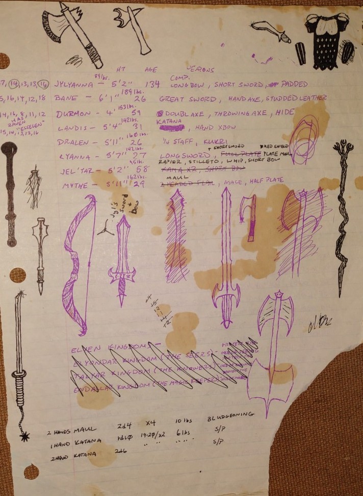 Well, good night, Wrizzlers. I leave you with a 28-year-old page of notes, so please excuse the stains. However, if you read, Why I Write, these are the NPCs I mentioned at the top with their D&D v.3 stats and some equipment. I do have my moments when I draw....[[|:-)