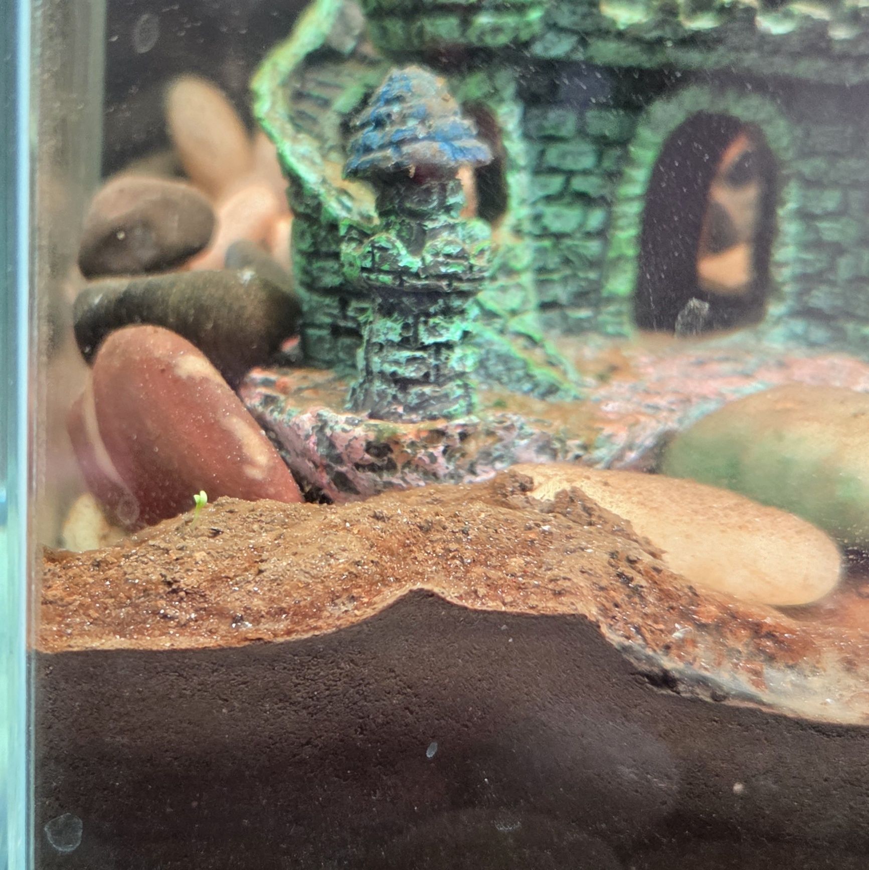 That tiny green sprout in front of the red rock? I have no idea who that is! It must have been in the mud, but the mud was carefully sifted and prepared. It must have been very, very tiny. That makes me hope whoever it is can stay.