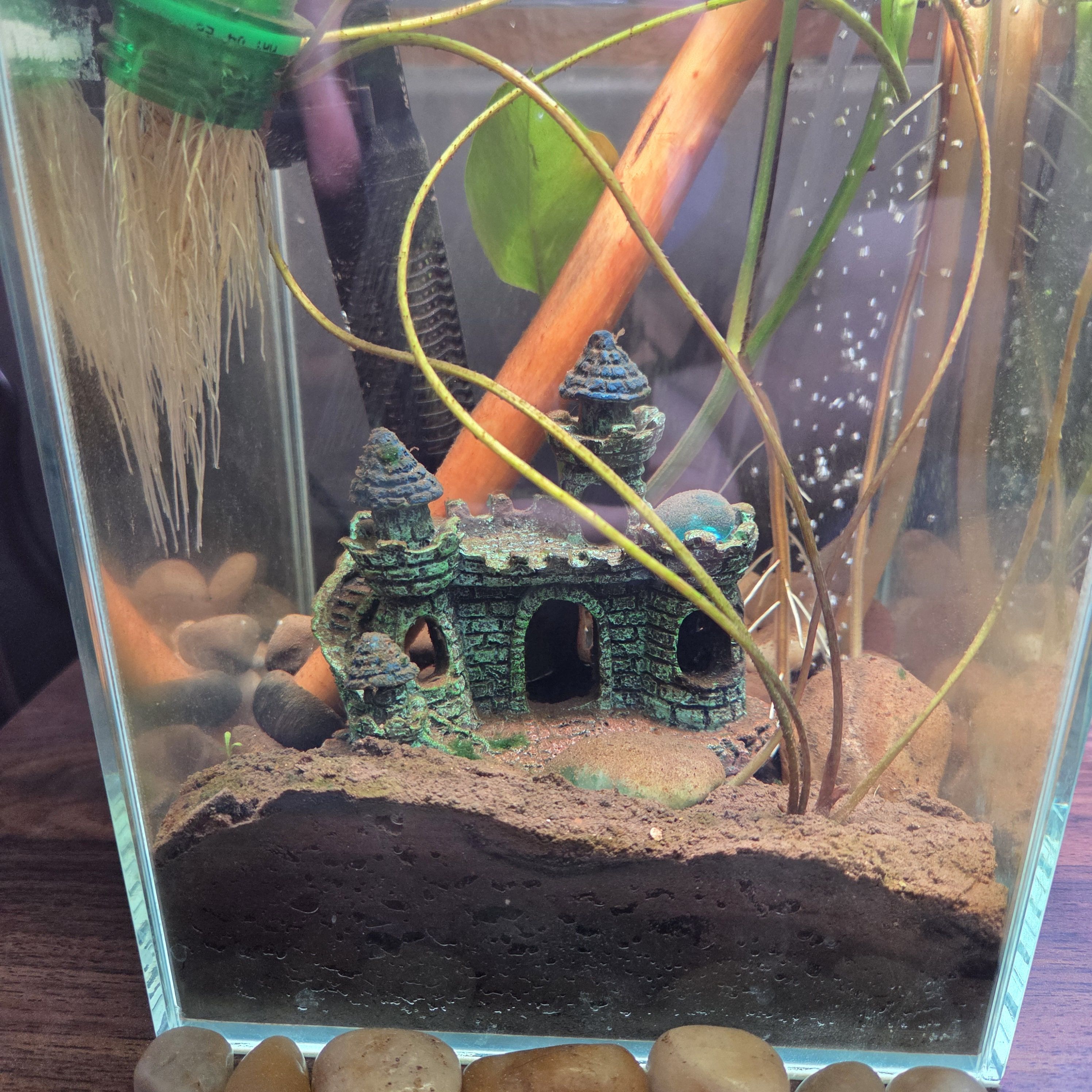 I give above the surface updates all the time. Here's a look at what's happening underwater in the aquatic garden. It's kind of hard sometimes to tell the difference between Ted's (pothos) roots and Rufus's (lotus) stems without a view from a different angle. Bill (spider plant, roots on left side) will get his roots pruned soon. I have to control his growth.