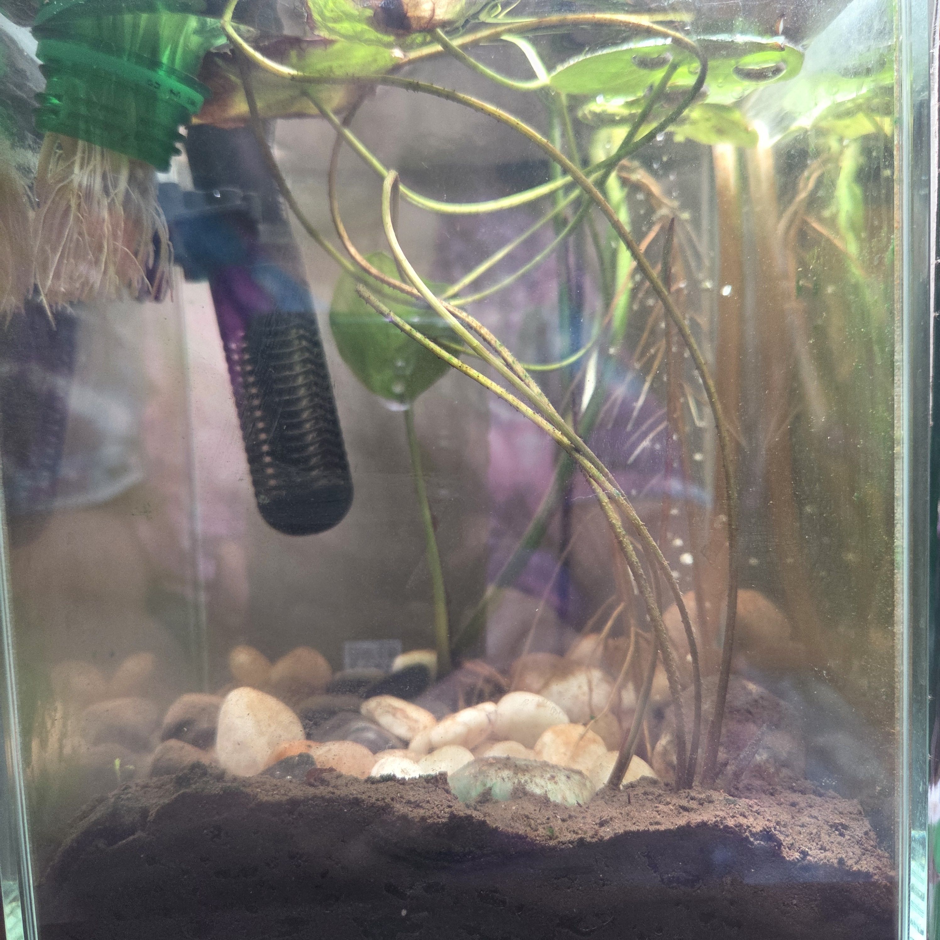 I took the castle out. Rufus needs more space. Ted's roots are probably good with the space they have, and it's mostly going to be his pothos vine getting longer above the surface. Bill's roots don't take much space and need to be trimmed now and then so I don't end up with a spider plant that fills the tank. Rufus, though... Stems growing everywhere! I may have to add more mud and/or rocks at some point.